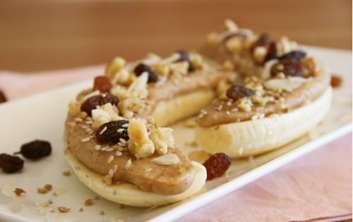 2 столовые ложки арахисовой пасты смешайте с чайной ложкой тхины (паста из кунжута). Этой смесью намажьте половинки банана, сверху полейте медом или кленовым сиропом. Посыпьте сэндвичи изюмом, семенами чиа, грецкими орехами, миндальными хлопьями.