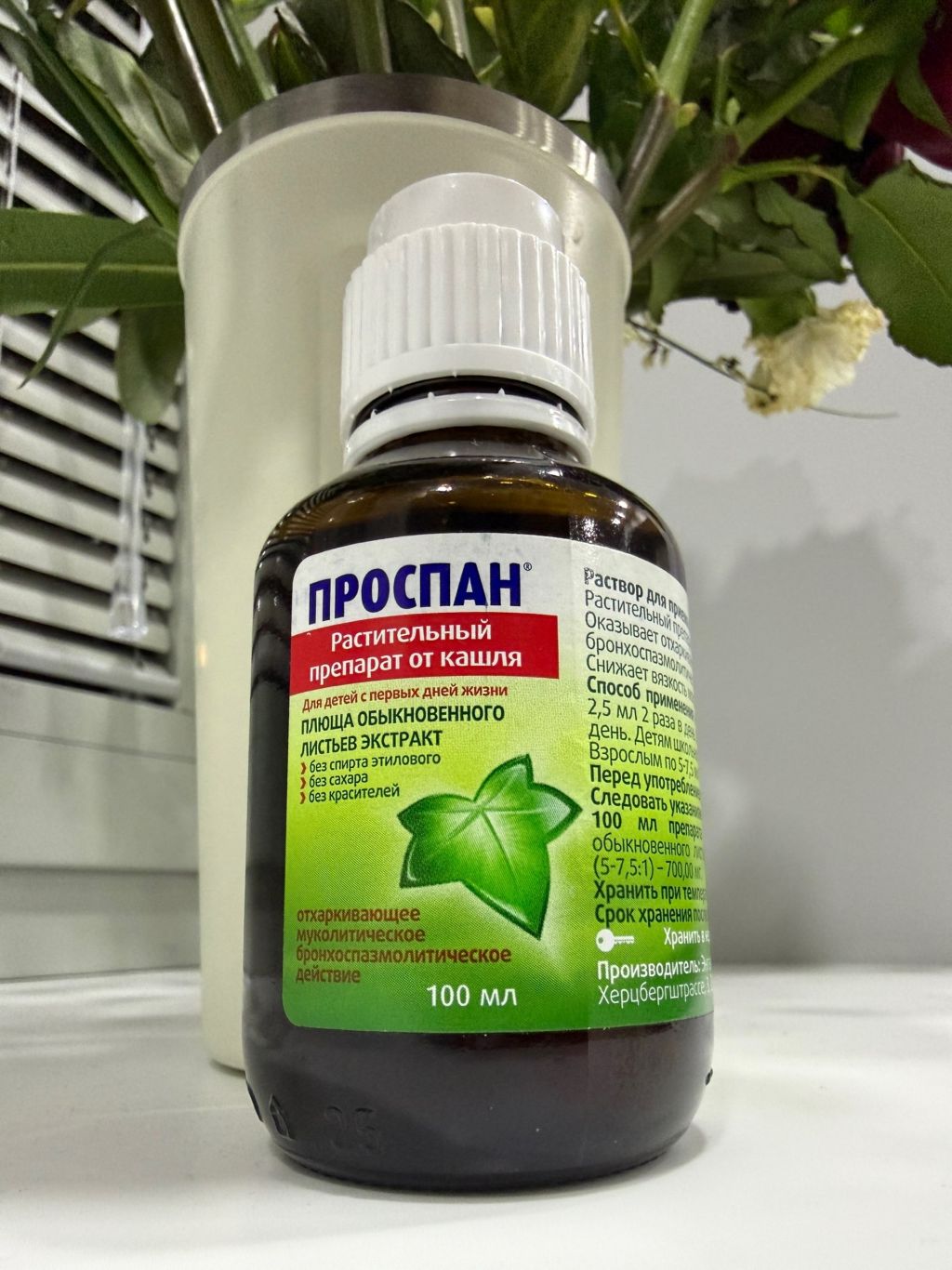 Состав:1 мл сиропа Проспан содержит активное действующее вещество – сухого экстракта плюща - 7, 000 мг.